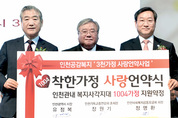 유정복 인천시장이 16일 선학실내체육관에서 장원기 인천기독교총연합회 총회장과 인천사회복지공동모금회장과 함께 ‘1004 착한가정 사랑언약식’에 서명 후 기념촬영을 하고 있다. /인천시 제공