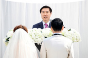 1일 오후 굿모닝하우스에서 열린 ‘소외계층을 위한 2017년 1회 행복한 출발 작은결혼식’에서 이재율 경기도 행정1부지사가 주례사를 하고 있다. /경기도 제공