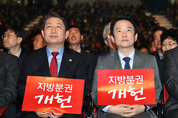 지난 3일 오후 대구 엑스코에서 열린 ‘지방분권 개헌 대구 결의대회’에서 남경필 경기도지사(우)와 권영진 대구시장(좌)이 경청하고 있다. /경기도 제공