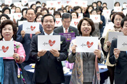 유정복 인천시장이 지난 6일 시청 대회의실에서 열린 ‘2017 인천여성 신년인사회’에서 주요 인사들과 함께 ‘우리는 인천’이라는 슬로건을 외치고 있다./인천시 제공