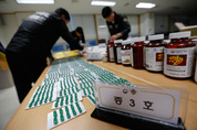 24일 인천해해양경비안전서 수사관들이 압수한 중국산 가짜 의약품을 분류하고 있다. 인천해경은 이날 중국에서 밀수한 가짜 정력제 수천만원어치를 국내에 불법 유통한 혐의로 A(55·여)씨를 구속하고 A씨의 남편 B(59)씨를 지명수배했다./인천해경 제공