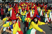 지난 15일 가평군 가평역 앞에서 참여형 거리축제 '까르네발레 가평' 행사가 열려 참가자들이 이국적 의상을 차려입고 축제를 즐기고 있다. /가평군 제공