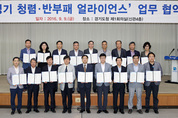 경기도와 도 산하 16개 공공기관, 한국투명성기구가 9일 도청 제1회의실에서 열린 ‘경기 청렴 반부패 얼라이언스 업무 협약식’에서 협약서에 서명한 뒤 기념촬영을 하고 있다./경기도 제공