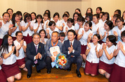 남경필 경기도지사와 이재정 교육감이 30일 도교육청에서 열린 ‘2016년 8월말 퇴직교원 및 교육전문직원 훈포장 전수식’에서 훈포장 전수 및 표창장 수여를 마친 뒤 학생들과 기념촬영을 하고 있다./경기도 제공
