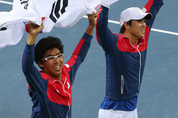 정현(수원 삼일공고)과 임용규(충남 당진군청)이 한국 테니스 남자 복식 조로는 28년 만에 아시안게임 금메달을 목에 걸었다. 정현-임용규 조는 29일 인천 부평구 열우물 테니스경기장에서 열린 2014 인천 아시안게임 테니스 남자복식 결승에서 인도의 사남 싱-사케스 미네니 조와 매 세트 접전을 펼친 끝에 세트 스코어 2-0(7-5 7-6)으로 승리를 거뒀다. 이로써 정현-임용규 조는 1986년 서울 아시안게임에서 김봉수-유진선 조가 테니스 남자 복식 사상 처음으로 금메달을 획득한 이후 28년 만에 정상에 오르는 감격을 누렸다. 정현-임용규 조는 특히 2010년 광저우 대회에서 ‘노 골드’의 수모를 당한 데 이어 남녀 단식, 남녀 복식, 남녀 단체전, 혼합 복식 등 7개 금메달이 걸린 이번 대회에서 유일하게 결승에 진출, 금메달을 목에 걸며 한국 테니스의 자존심을 살렸다. 전날 유키 밤브리-디비즈 샤란 조(인도)에게 마지막 세트 슈퍼 타이 브레이크까지가는 접전 끝에 세트 스코어 2-1(6-7 7-6 11-9)로짜릿한 역전승을 거둔 정현-임용규 조는 비 때문에 3시간 30분 가량 경기가 지연됐지만 최상의 컨디션을 유지하며 기세를 이어갔다. 첫