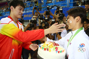 인천 아시안게임 수영에서 은 1개, 동메달 5개를 획득하며 한국 선수 중 아시안게임 통산 최다 메달 신기록(20개)을 수립한 박태환(인천시청·25)이 이번 대회 일정을 모두 마치면서 자신의 이름을 딴 수영장에서 특별한 생일 축하를 받았다. 박태환은 지난 26일 인천 문학박태환수영장에서 열린 이번 대회 수영 경영 마지막 종목인 남자 혼계영 400m에서 동메달을 획득한 뒤 시상식에서 ‘라이벌’ 쑨양(중국·23)으로부터 생일 케이크와 축하카드를 선물로 받았다. 이날 깜짝 이벤트는 쑨양이 직접 준비한 것으로 남자 혼계영 400m 시상식이 끝난 뒤 쑨양이 케이크를 든 행사 진행요원과 함께 나타나며 시작됐다. 장내 아나운서가 대회 다음날인 27일이 박태환의 생일이라고 소개한 뒤 쑨양이 이를 축하하기 위해 케이크를 준비했다고 말했다. 쑨양은 앞서 한국 선수단 관계자에게 박태환의 생일을 축하해 주고 싶다는 뜻을 밝혀온 것으로 전해졌다. 케이크에는 ‘태환아, 생일 축하해’라는 한글 인사가 적혀있었다. 이 케이크는 응원을 위해 한국을 찾은 자신의 어머니에게 부탁했고 쑨양은 응원을 위해 한국을 찾은 어머니에게