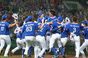 한국 야구가 아시안게임 2연패를 달성하며 아시아 야구 최강의 자존심을 지켰다. 류중일 감독이 이끄는 한국은 28일 인천 문학구장에서 열린 2014 인천 아시안게임 야구 결승전에서 ‘복병’ 대만에 6-3으로 짜릿한 역전승을 거두며 2010년 광저우 아시안게임 우승에 이어 2회 연속 정상에 올랐다. 김광현을 선발로 내세운 한국은 초반 대만의 선발투수 궈쥔린을 공략하지 못해 고전했다. 한국은 1회초 민병헌, 손아섭의 연속 안타와 김현수의 볼넷으로 무사 만루 찬스를 잡았지만 박병호와 강정호가 연속 삼진으로 물러나고 나성범마저 1루 땅볼로 아웃되며 결정적인 득점 기회를 놓쳤다. 한국은 곧이은 대만의 반격때 첫 실점을 허용했다. 1회말 김광현이 대만의 선두타자 천핀지에에서 우중간 3루타를 허용한 뒤 린한의 내야땅볼로 한 점을 내준 것. 후속 타자를 투수앞 땅볼과 도루저지로 막아낸 한국은 4회까지 이렇다할 득점 기회를 잡지 못한 채 0-1로 끌려갔다. 한국은 5회 황재균의 좌익선상 안타와 연이은 희생번트, 민병헌의 볼넷으로 만든 2사 1,3루 기회에서 손아섭의 우전안타로 1-1 동점을 만든 뒤 김현수의 타구 때 상대 유격수 실책으로 1점을 보태 2-