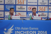 인천 아시안게임 역도에서 세계신기록을 수립하며 금메달을 휩쓴 북한의 김은국(26)과 엄윤철(23)이 23일 송도 메인프레스센터에서 기자회견에서 가졌다. 두 선수는 부상을 극복하고 괴력을 과시한 비결과 방한 소감을 차례로 밝혔다. 김은국은 “어릴 때부터 많은 훈련을 했고 허리부상으로 고통을 겪었다”고 털어놨다. 그러나 그는 “김정은 원수의 사랑과 배려 덕분에 고통을 극복하고 큰 성과를 거둘 수 있었다”고 말했다. 세계신기록 수립의 비결을 묻는 질문에 엄윤철은 기자들에게 “달걀로 바위를 깰 수 있다고 생각하십니까?”라고 반문한 뒤 “원수님께서 달걀에 (주체)사상을 넣으면 바위도 깰 수 있다고 했는데 이번에 그것을 행동으로 보여준 것”이라고 말했다. 이어 “세계신기록을 세우고 공화국을 빛나게 한 힘의 비결은 바로 원수님의 사상”이라고 덧붙였다. 엄윤철은 20일 역도 남자 56㎏급 용상에서 세계신기록(170㎏)을 세웠고, 김은국은 다음날 62㎏급 인상(154㎏)과 합계(332㎏)에서 세계신기록을 작성했다. 역도 경기장, 선수촌 생활, 향후 일정, 한국에 대한