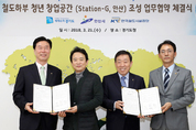 경기도는 21일 도청에서 안산시, 한국철도시설공단과 고잔역 철로 아래 880㎡에 창업 오픈 플랫폼 ‘스테이션 지(Station-G, 안산)’ 조성 업무협약을 체결했다. 이날 협약 체결식에서 김상균 한국철도시설공단 이사장(왼쪽부터), 남경필 도지사, 제종길 안산시장, 양근서 경기도의원이 업무협약서에 서명을 한 뒤 기념사진 촬영을 하고 있다./경기도 제공
