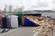 5일 오후 경기도 용인시 기흥구 경부고속도로 부산방면 수원신갈 톨게이트 진입 램프구간에서 코너를 돌던 25t 화물차가 옆으로 넘어졌다. 이 사고로 운전자가 경상을 입어 병원으로 옮겨졌고, 도로 위에 목재 폐기물이 쏟아지면서 2㎞ 구간이 극심한 정체를 빚었다. /경기남부지방경찰청 제공