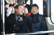 유정복 인천시장이 5일 청라 GRT주차장에서 열린 ‘청라 신교통(GRT) 개통식’에 참여해 제갈원영 인천시의회의장과 바이모달트램을 시승하고 있다. /인천시 제공