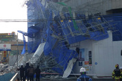 10일 오후 용인시 처인구 포곡읍의 한 관광호텔 신축공사장에서 3층 높이까지 설치된 철제 펜스와 가림막이 무너지는 사고가 발생해 행인 1명이 다쳤다. 사진은 사고 현장. /경기도재난안전본부 제공