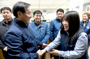 유정복 인천시장이 8일 인천교통공사에서 열린 ‘교통공사 주요업무보고’에서 첫 출근한 아르바이트 학생과 인사를 나누하고 있다. /인천시 제공
