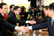 조명균 통일부 장관을 비롯한 남측 대표단이 9일 오전 남북 고위급회담이 열리는 판문점 남측 평화의 집에서 리선권 조국평화통일위원회 위원장을 비롯한 북측 대표단과 전체 회의 시작에 앞서 악수를 하고 있다. /사진공동취재단