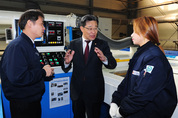 최수규 중소벤처기업부 차관(가운데)이 28일 시흥시에 있는 ㈜프론텍을 방문해 스마트공장 구축현황을 시찰하고 민수홍 ㈜프론텍 대표(왼쪽)로부터 설명을 듣고 있다. /중소벤처기업부 제공