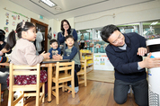 남경필 경기도지사가 27일 오전 안산시 시립 ‘별빛 어린이집’ 을 방문해 어린이집의 실내공기질 실태를 살펴보고 학부모, 보육교직원과의 간담회를 진행했다. 사진은 남 지사가 어린이들에게 현장에 설치된 공기청정기에 대해 설명하고 있는 모습./경기도 제공