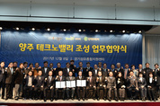 지난 8일 양주 소재 경기섬유종합지원센터에서 (앞줄 왼쪽 7번째부터)이성호 양주시장, 남경필 경기도지사, 김용학 경기도시공사 사장이 ‘양주테크노밸리 조성을 위한 업무협약’을 체결한 후 참석자들과 화이팅을 외치고 있다./경기도 제공