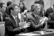 유정복 인천광역시장(사진 왼쪽)이 26일 송도 센트럴파크호텔 3층에서 열린 ‘2017 인차이나포럼’ 행사에서 추궈홍 주한중국대사와 함께 내빈소개에서 환영의 박수를 치고 있다. /인천시 제공