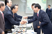 11일 시청 장미홀에서 가진 ‘역대 지역국회의원 초청 오찬간담회’에서 유정복 인천시장이 역대 지역 국회의원들에게 돌아가며 인사를 하고 있다. /인천시 제공