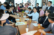 남경필 경기도지사가 22일 오후 동탄호수공원미래체험관(홍보관전망대)에서 동탄2신도시 호수공원 조성공사 관련하여 주민들의 민원을 청취하며 조광명 경기도의회 의원, 김용학 경기도시공사 사장, 백원국 도시주택실장, 황성태 화성시 부시장 등과 함께 현장 간담회를 주재하고 있다. /경기도 제공