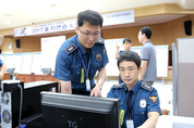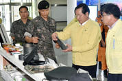 유정복 인천시장이 21일 시청 종합상황실에서 ‘2017 을지연습 최초 상황보고’를 받고 안보장비 전시장를 참관하고 있다. /인천시 제공