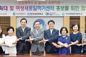 유정복 인천시장이 9일 시청 영상회의실에서 열린 ‘여성고용확대 및 여성새로일하기센터 홍보를 위한 협약체결식’에서 이강신 인천상공회의소 회장 등과 협약을 체결한 뒤 손을 맞잡고 기념촬영을 하고 있다. /인천시 제공