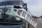 1일 오전 10시께 경기도 평택시 청북읍 39번 국도에서 주행 중인 화물차에 실려있던 철제 사다리가 떨어지면서 맞은 편 차로에서 진행 중이던 관광버스 운전석 창문을 뚫고 들어가는 사고가 발생했다. 사진은 철제 사다리에 의해 앞 유리창이 깨진 관광버스./경기 송탄소방서 제공