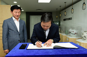 김동근 경기도 행정2부지사(왼쪽)가 12일 오전 경기도청 국제회의실에서 웬 수언 동 베트남 하남(Ha Nam)성장과 만나 양 지역간의 교류협력에 대해 논의한 뒤 방명록 서명을 지켜보고 있다./경기도 제공