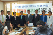 민주노동당 인천시당(이용규 위원장, 왼쪽서 4번째)이 배출한 6.2 지방선거 구청장 및 광역, 기초 의원 당선자들이 기자회견을 통해 지방자치의 모범을 만들겠다는 각오를 피력하고 있다. 민주노동당 인천시당은 7일 오전 인천시청에서 6.2 지방선거 당사자 합동기자회견을 갖고 수도권에서 지방자치의 모범을 만들 것을 다짐했다. 이용규 인천시당위원장은 “시민들이 야권단일 후보에게 아낌없는 지지를 보내 압도적인 수의 야당 후보들이 당선됐다”면서 ”특히 수도권 최초의 민노당 구청장 배출로 무거운 책임감을 느끼며 시민들과 함께 대안과 비전을 만들어가는 정당으로 자리매김하겠다”고 약속했다. 특히 “이번 선거는 지난 10년동안 지방권력을 장악했던 한나라당에 대한 민심의 심판이 이뤄진 선거였으며, 새로운 시대에 대한 변화의 요구를 드러낸 선거로 민노당은 야권단일화를 모범적으로 이뤄내 야권과 시민사회가 함께 힘을 모은 결과”라고 피력했다. 이 위원장은 “이번 선거에서 수도권 최초 민노당 구청장 탄생으로 무거운 책임감을 느끼며, 인천시민들과 함께 대안과 비전을 만들어가는 정당으로 자리매김하도록 인천시민의 목