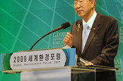 반기문 유엔 사무총장은 11일 "기후변화를 막기 위해 이제는 행동에 나서야 할 때"라고 말했다. 반 총장은 이날 오전 10시 인천 경제자유구역 내 송도 컨벤시아에서 개막된 '2009 세계환경포럼(Global Environment Forum 2009)' 기조연설을 통해 "빈곤과 질병, 기아, 안보불안, 에너지 위기 등의 근본 원인인 기후변화라는 '역경'을 뛰어넘기 위해서는 용기와 리더십이 필요하다"면서 이 같이 강조했다. 반 총장은 특히 오는 12월 덴마크 코펜하겐에서 개최되는 제15차 유엔 기후변화 당사국 회의와 관련, "인류의 미래는 우리의 선택에 달려있다"면서 "선진국과 개도국간 신뢰를 바탕으로 이번에 반드시 공정하고 효율적인 합의를 도출해야 한다"라고 역설했다. 그는 "우리는 기후변화에 대응하기 위해 어떤 일을 어떻게 해야하는지 모두 알고 있으며 그에 필요한 자금과 능력, 기술도 모두 갖춰져 있다"면서 "이제 필요한 것은 행동에 나서려는 의지"라고 말했다. 반 총장은 이어 "지난달이번 포럼의 공동조직위원