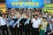 “균형없는 지역발전정책, 즉각 폐지하라.” 수원지역 상공업계가 정부의 ‘선지방발전, 후수도권 규제 완화’를 골자로 한 지역발전 추진전략에 대해 강력히 반발하고 나섰다. 이를 위해 수원상공회의소(이하 수원상의)는 9일 수원역 광장에서 ‘수도권 규제 철폐를 위한 천만인 서명운동’을 벌였다. 오후 2시부터 실시된 서명운동에는 상의직원 10명과 수원시청 지역경제과 직원 10여명 등 50여명의 관계자들이 ‘수도권 규제 철폐’가 새겨진 허리띠를 두르고 거리를 지나는 시민들에게 팜플렛을 나눠주며 동참을 호소했다. 이날 수원상의는 ▲군사시설 주변지역에 대한 피해보상 및 미군기지 반환공여구역에 대한 지원 특별법 제정 ▲자연보전권역 중복규제 완화 ▲팔당댐 용수사용료 징수권 경기도 이양 및 팔달지역 용수사용료 면제 ▲그린벨트제도 전면 개선 ▲공업용지 총량, 건축총량, 물류단지 총량 등 기업규제 폐지 및 첨단대기업 신·증설 허용 ▲서해안 복합특구 추진 등을 촉구했다. 오후 3시쯤 현장에 도착한 김용서 시장은 격려사에서 “정부가 지난 7월 21일 발표한 ‘선지방발