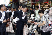 “추석 명절은 전통시장과 함께 합시다.” 경기중소기업청은 10일 추석을 맞아 수원의 전통시장인 팔달문 시장에서 ‘추석맞이 전통시장 이용 캠페인’을 벌였다. 이날 행사는 최근 경기침체와 소비자 구매심리 위축 등으로 어려움을 겪고 있는 지역 전통시장 상인들의 사기진작과 전통시장의 활성화를 도모하기 위해 마련됐다. 이날 행사에는 심동섭 경기중소기업청장을 비롯해 임종철 경기도 경제정책과장, 이중화 수원시 통상국장, 홍용술 중진공 경기지역본부장 등 유관기관 임직원과 경기도시장상인연합회 임원 등 40여명이 참여했다. 심동섭 경기중소기업청장은 인사말에서 “시장경영지원센터 시장조사 결과에 따르면 재래시장이 대형마트에 비해 올해 추석 제수용품을 구입하는 비용이 약 30%저렴한 것으로 나타났다”며 “이는 평균 16만원 수준으로 약 5~6만원 가량 절약할 수 있는 수준”이라고 말했다. 이어 최극렬 경기도상인연합회장은 “재래시장은 오랜 전통을 가진 시장임에도 불구하고 대형마트에 밀리는 등 어려움을 겪고 있다”면서 “시장 자체내에서도 자구적인 노력을 기울이고 있지만