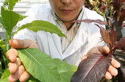 농촌진흥청은 세계 최초로 항산화와 항염, 함암 기능이 우수한 천연 안토시아닌 색소를 담배와 배추에서 대량 생산할 수 있는 기술 개발에 성공했다고 24일 밝혔다. 농촌진흥청 농업생명공학연구원 임선형 박사 연구팀은 옥수수(B-peru)와 애기장대(cPAP1-D)에서 뽑아낸 조절유전자 2종을 모델 식물인 담배에 함께 적용했을때 안토시아닌이 대량 생산된다는 새로운 사실을 밝혀냈다. 그동안 국내외 여러 연구진은 안토시아닌 색소를 생산하는 새로운 작물 개발에 노력했으나 뚜렷한 성과를 내지 못했다. 담배가 생산하는 안토시아닌은 특히 항암(폐암억제)와 시력개선 활성이 우수한 것으로 알려진 시아니딘 루티노사이드 형태인 것으로 밝혀졌으며 식물체 생체 1kg 당 약 5g의 안토시아닌이 생산됐다. 특히 담배가 생산하는 안토시아닌은 시아니딘 루티노사이드 형태로 블랙베리(검은 딸기)에 많이 들어 있다. 연구원에 따르면 블랙베리는 생체 1㎏ 당 안토시아닌 75∼700㎎이 생산되지만, 안토시아닌 생산 담배 1㎏은 블랙베리의 7배인 약 5g의 안토시아닌이 생산되기 때문에 이를 정제할 경우 고기능성 천연식품첨가제와 천연색소로서 가치가 무궁무진할 것으로 기대된다. 또한 사람이 피우는