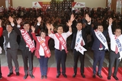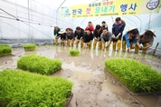20일 오전 이천시 호법면의 한 비닐하우스 논에서 열린 ‘임금님표 이천쌀 첫 모내기’ 행사에서 엄태준 이천시장을 비롯한 참석자들이 모를 심고 있다. ▶▶관련기사 9면 /연합뉴스