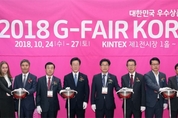 24일 경기 고양시 킨텍스에서 열린 국내 최대규모 중소기업 전문 전시회 ‘2018 지페어 코리아(G-FAIR KOREA)’ 개막식에서 이재명 경기도지사(가운데)와 조광주 경제과학기술위원회 위원장, 배국환 경기도경제과학진흥원 이사장, 이창구 전국중소기업지원센터협의회 부회장 등 참석자들이 기념촬영을 하고 있다./연합뉴스