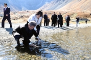 “한라산 물을 갖고 왔어요. 천지에 가서 반은 붓고 반은 백두산 물을 담아갈 겁니다.” 김정은 북한 국무위원장 부부와 함께 20일 오전 백두산 천지가 한눈에 내려다보이는 장군봉에 오른 문재인 대통령의 부인 김정숙 여사는 500㎖ 플라스틱 생수병을 꺼내며 이렇게 말했다. 청와대에 따르면 김 여사는 천지 물을 담아 합수할 생각으로 생수병에 제주도 한라산 물을 채워서 가져왔다. 리설주 여사가 “우리나라 옛말에 ‘백두에서 해맞이를 하고 한라에서 통일을 맞이한다’는 말이 있다”고 하자, 이에 화답하듯 김 여사는 생수병을 내보이며 이같이 말했다. 김 위원장이 문 대통령에게 “오늘 천지에 내려가시겠습니까”라고 물었고, 문 대통령이 “천지가 나무라지만 않는다면 손이라도 담가보고 싶다”고 웃으며 화답하면서 남북 정상 부부는 천지로 향했다. 케이블카를 타고 천지로 내려간 문 대통령 부부는 김 위원장 부부와 함께 천지 주변을 산책하다, 김 여사가 준비해온 생수병에 담긴 한라산 물을 천지에 조금 부었다. 백두와 한라의 ‘합수’였다. 무릎을 굽혀 앉은