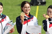 27일 오후(현지시간) 인도네시아 자카르타 겔로라 붕 카르노(GBK) 양궁장에서 열린 ‘2018 자카르타 팔렘방 아시안게임’ 양궁 리커브 여자 단체 시상식에서 금메달을 획득한 강채영(왼쪽부터), 이은경, 장혜진 메달을 목에 걸고 포즈를 취하고 있다. /연합뉴스