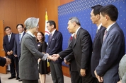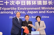 김은경 환경부 장관(오른쪽)이 24일 중국 쑤저우에서 미세먼지 등 동북아 환경현안을 논의하기 위해 열린 제20차 한중일 환경장관회의(TEMM20)에 참석해 리간제 중국 생태환경부 장관(가운데), 나카가와 마사하루 일본 환경성 장관과 함께 회의 결과를 담은 공동합의문에 서명하고 기념촬영을 하고 있다./연합뉴스