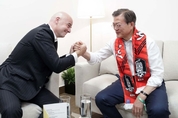 2018 러시아 월드컵 한국 대 멕시코의 경기를 관전한 문재인 대통령은 23일(현지시각) 전반전이 끝나고 잔니 인판티노 국제축구연맹(FIFA) 회장과 환담하면서 “회장님을 처음 만나 월드컵 남북 공동개최를 말했는데 그게 점점 현실화하고 있다”고 말했다. 이에 인판티노 회장은 “지금부터 준비해야 한다”면서 “대통령이 부르면 언제든지 달려가겠다”고 화답했다. 인판티노 회장은 또 “대통령이 남북 공동개최를 말씀하신 게 불과 1년 전이었는데 그때만 해도 실감 나지 않았으나 그 사이에 많은 일이 일어났다”며 “아주 많은 일을 해내셔서 모든 사람이 대통령을 사랑한다”고도 했다. 인판티노 회장은 “한국뿐만 아니라 한국 밖의 사람들, FIFA 관련자들뿐 아니라 축구와 무관한 사람도 대통령을 사랑한다”면서 “대통령의 열성과 집요함, 그리고 추구하는 가치가 힘을 발휘했다”고 평가했다. 그러면서 “한국에 곧 가겠다”고 덧붙였다. 문 대통령은 이날 경기가 열린 로스토프나도누의 로스토프 아레나 귀빈석에서 부인