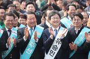 9일 오후 경남 하동군 화개장터에서 열린 바른미래당 동서화합한마당에서 박주선, 유승민 공동대표가 박수를 치고 있다. 왼쪽부터 바른미래당 정운천 의원, 박주선 공동대표, 유승민 공동대표, 박종진 전 앵커./연합뉴스