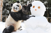 매서운 한파가 계속되고 있는 25일 오전 용인시 에버랜드에서 암컷 판다 아이바오가 눈사람으로 장난을 치고 있다. /연합뉴스