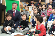 문재인 대통령이 24일 오전 보육정책과 관련한 현장 방문으로 서울 도봉구 한그루 어린이집을 방문해 어린이들과 마술공연을 관람하며 함박 웃음을 짓고 있다./연합뉴스
