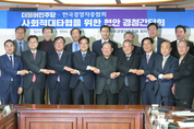 더불어민주당 우원식 원내대표와 박병원 경총회장이 17일 오후 서울 마포구 경총회관에서 열린 더불어민주당·한국경영자총협회 사회적 대타협을 위한 현안 경청 간담회에서 참석자들과 함께 기념촬영을 하고 있다./연합뉴스