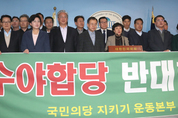 국민의당 박지원 전 대표와 정동영·천정배·최경환 의원 등 국민의당 지키기 운동본부 소속 의원들과 지역위원장들이 14일 국회 정론관에서 기자회견을 열고 “안철수 대표의 군사쿠데타식 불법 당무위를 인정하지 않고 가능한 모든 수단과 방법을 동원해 보수야합 불법 전당대회를 저지무산시키는데 총력을 다할 것이다”고 주장하고 있다./연합뉴스