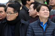 7일 국민의당 박지원 전 대표(왼쪽), 안철수 대표가 전남 여수세계박람회장에서 열린 여수마라톤대회 개막식에 참석해 서로 다른 곳을 바라보고 있다./연합뉴스