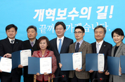 바른정당 유승민 대표가 4일 국회에서 열린 최고위원·국회의원 연석회의에서 신임 지역위원장에게 임명장을 수여한 뒤 기념촬영을 하고 있다./연합뉴스
