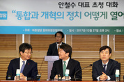 국민의당 안철수 대표가 27일 오후 국회 의원회관에서 바른정당 원외 지역위원장들의 초청으로 열린 간담회에 참석해 유승민 대표와 대화를 나누고 있다. 오른쪽은 바른정당 하태경 최고위원./연합뉴스
