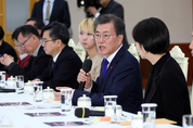 문재인 대통령이 26일 오후 청와대에서 ‘삶이 먼저다’를 기치로 자신이 위원장을 맡은 제6기 저출산·고령사회위원회의 간담회를 주재하고 있다. 왼쪽부터 정현백 여성가족부 장관, 김동연 부총리 겸 기획재정부 장관, 조소담 위원, 문 대통령, 장지연 위원, 김상곤 부총리 겸 교육부 장관./연합뉴스