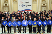 문재인 대통령이 21일 오후 재단법인 공공상생연대기금 관계자와 비정규직 처우개선·일자리 창출에 앞장선 노사대표를 청와대로 초청해 개최한 ‘상생연대실천 노사와의 만남’ 행사에서 ‘함께하면 더 멀리 갑니다’라고 쓴 톱니바퀴 모양의 손팻말을 들고 포즈를 취하고 있다./연합뉴스
