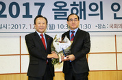 국회인권포럼·아시아인권의원연맹 주최로 11일 오전 국회 의원회관에서 열린 2017 올해의 인권상 시상식에서 태영호 국가안보전략연구원 자문연구위원(전 영국주재 북한공사)이 인권상을 수상하고 있다. 왼쪽은 국회인권포럼 대표인 자유한국당 홍일표 의원./연합뉴스